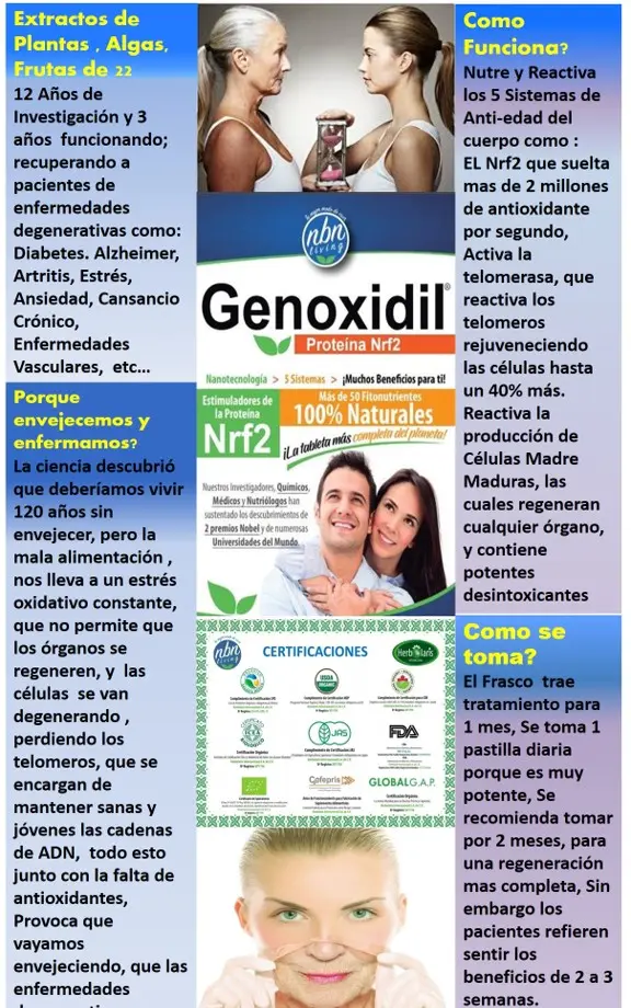 Los científicos se enfocaron en estos puntos y encontraron a través de diferente investigaciones, y con su propia experiencia haciendo medicamentos para farmacias, crearon Genoxidil, uniendo con la nanotecnología, fitonutrientes de 50, frutas, plantas y algas de 22 países diferentes, que nutren y activan el cuerpo, uniendo todos estos fitonutrientes, para ponerlos en una pastilla, enfocada a recuperar el desgaste físico y orgánicos de los cuerpos, poniendo los activos tan pequeños, que pueden pasar directo a los órganos y nutrirlos, activando diferentes sistemas del cuerpo, como vimos arriba, primero desintoxica el cuerpo , activando el Nrf2, que sueltan mas de 2 millones de antioxidantes en el cuerpo, limpiando por mucho el organismo, y gracias a las algas alfa, activa las células madre madura, aumentándolas y así activando el sistema de regeneración de los órganos, que por sistemas del cuerpo comienza con los mas afectados.