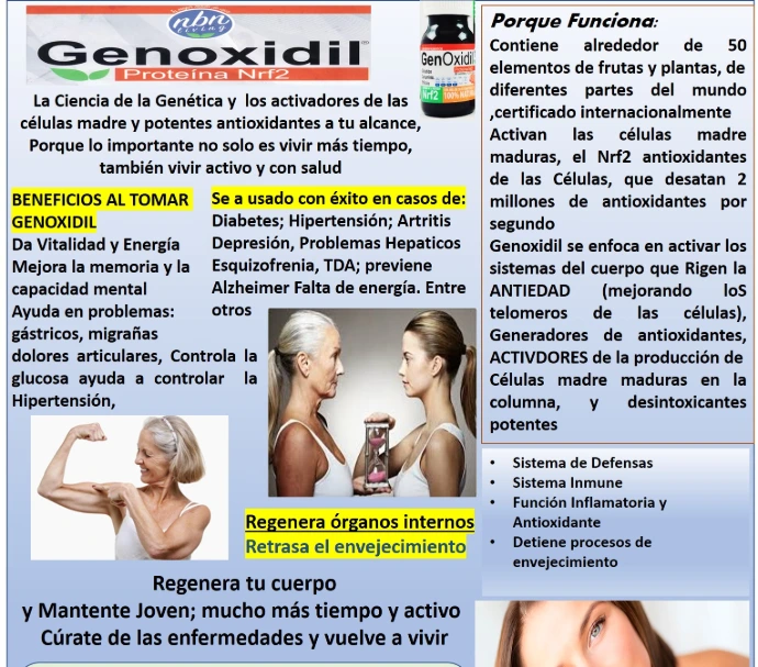 Los científicos de Nbn se enfocaron en estos puntos y encontraron a través de diferente investigaciones, y con su propia experiencia haciendo medicamentos para farmacias, y crearon Genoxidil, uniendo con la nanotecnología, fitonutrientes de 50, frutas, plantas y algas de 22 países diferentes, que nutren y activan el cuerpo, uniendo todos estos fitonutrientes, para ponerlos en una pastilla, enfocada a recuperar el desgaste físico y orgánicos de los cuerpos, poniendo los activos tan pequeños, que pueden pasar directo a los órganos y nutrirlos, activando diferentes sistemas del cuerpo, como vimos arriba, primero desintoxica el cuerpo, activando el Nrf2, que sueltan mas de 2 millones de antioxidantes en el cuerpo, limpiando por mucho el organismo, y gracias a las algas alfa, activa las células madre madura, aumentándolas y así activando el sistema de regeneración de los órganos, que por sistemas del cuerpo, comienza con los mas afectados.
